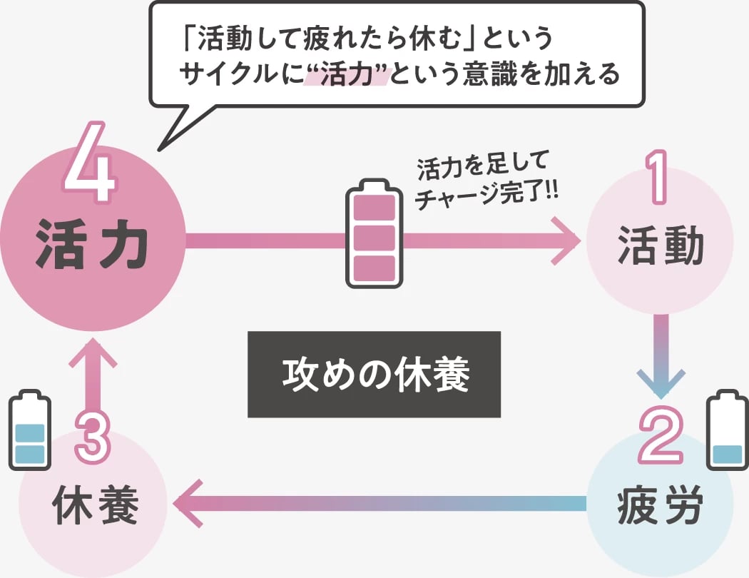 人の一日は「活動→疲労→休養」のサイクルで動いていますが、この流れでは約8割の人が、疲れが取れないと感じています。というのも、活動の対義語は休養ですが、疲労の対義語は休養ではなく活力だから。要は、活力が欠けているのです。休養によって活力を取り戻し、そのエネルギーをもって次の活動に向かう、つまり「活力を加えた休養」こそが、持続可能なサイクルなのです。