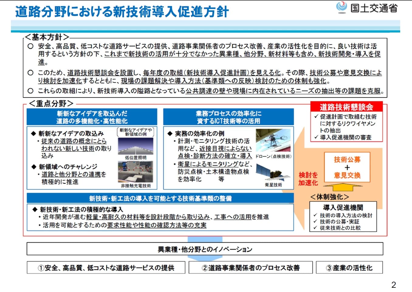 国の直轄では、点検支援技術の活用を原則化する取り組みが進んでいます。このねらいは、自治体での有効活用を促すこと、そして民間技術の開発を促進することにあります。