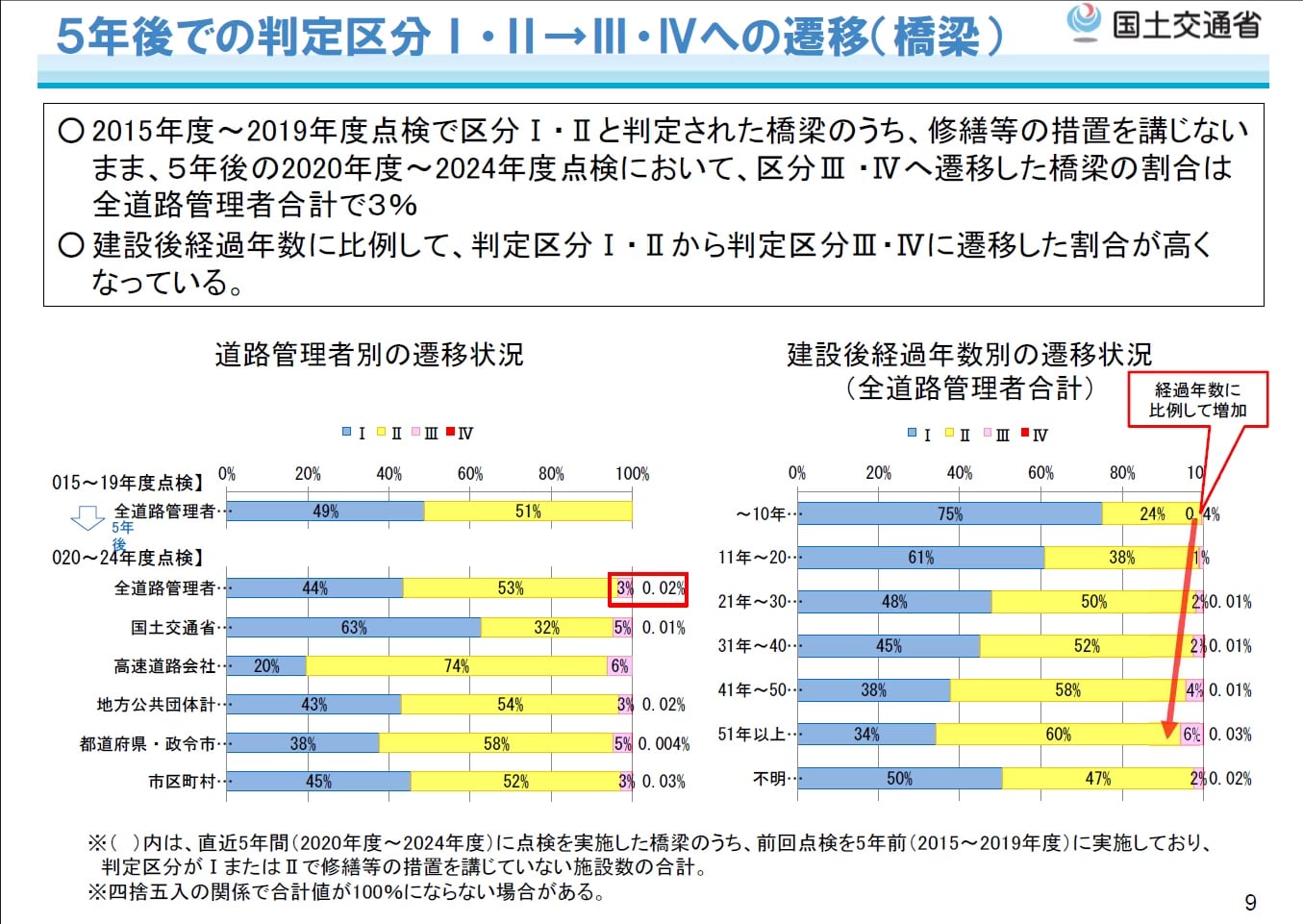 一方で、判定区分Ⅰ・Ⅱだった橋梁が、5年後の点検でⅢ・Ⅳに移行する割合は、全道路管理者平均で約3%となっています。建設後の経過年数が長いほど、その割合が高くなる傾向も確認できます。今後、老朽化した構造物がさらに増えていくことを考えると、5年に1回の定期点検を着実に継続していく必要性は変わりません。