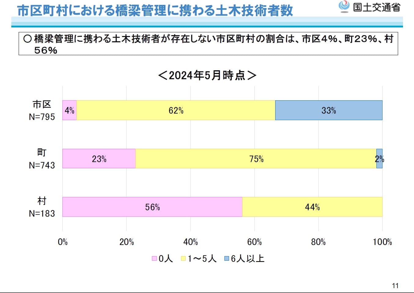 道路メンテナンスを巡る課題は、特に市町村で深刻です。橋梁管理に携わる土木技術者がいない自治体も少なくありません。そのため国としては、さまざまな支援策を講じています。