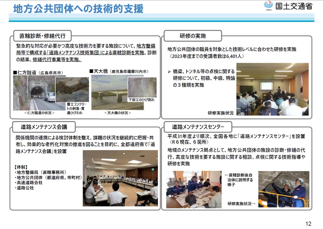 具体的には、緊急性が高く高度な技術を要する施設について、国が診断や修繕を代行する「直轄診断・修繕代行」を実施しています。また、地方公共団体の職員を対象とした研修も行い、技術力の底上げを図っています。さらに、道路メンテナンス会議を全都道府県に設置し、国の施策共有や課題整理を進めています。加えて、地方整備局ごとに道路メンテナンスセンターを整備し、自治体からの相談対応や技術的支援も行っています。人的支援と技術支援を組み合わせ、現場を支える体制を整えてきました。