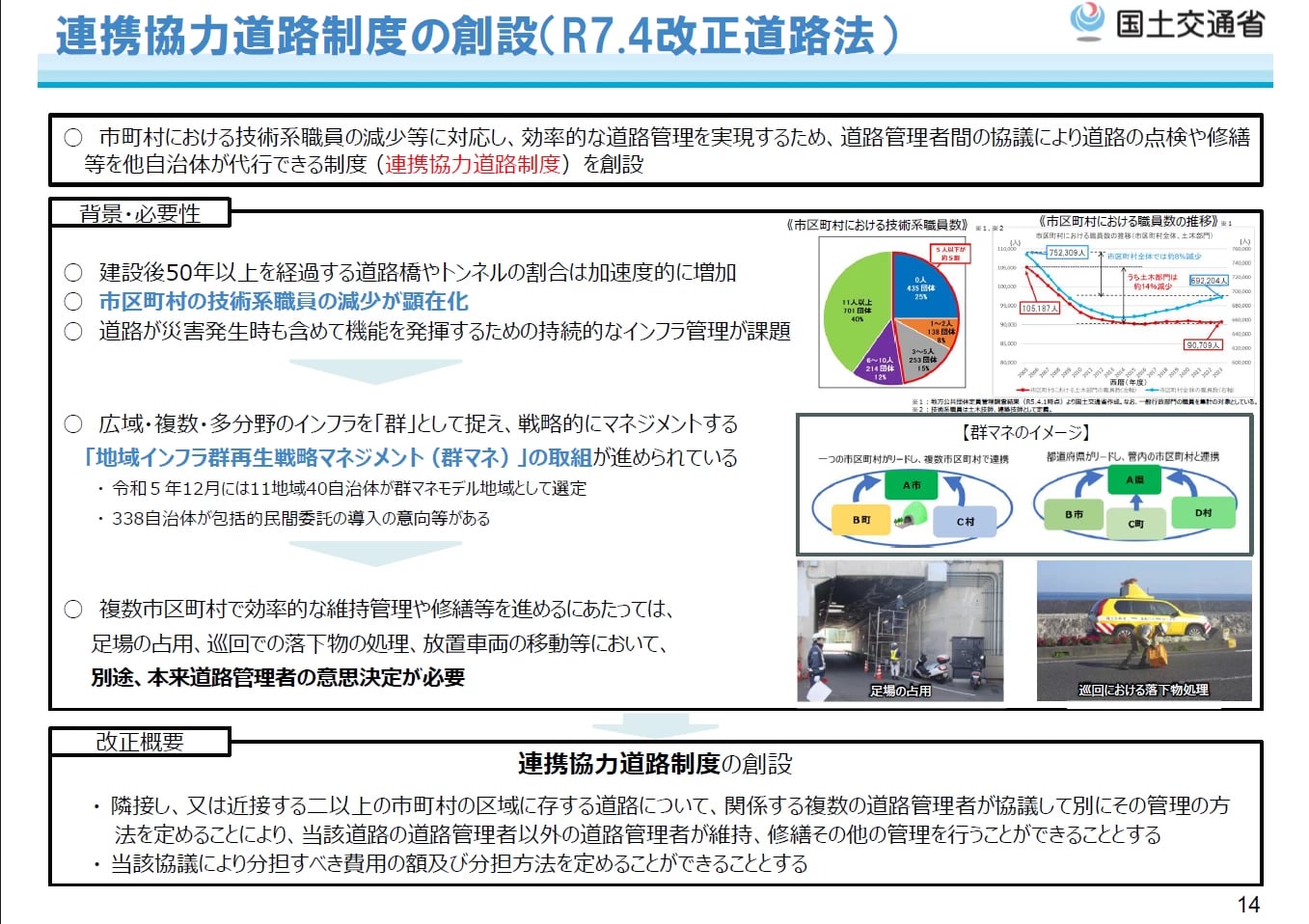この考え方を道路行政に反映するため、道路法を改正し、「連携協力道路制度」が創設されました。複数の市町村や県が協議し、維持管理や修繕を分担できる仕組みを制度として位置づけたものです。道路管理者の責任を曖昧にするのではなく、役割分担を明確にした上で、効率的な管理を可能にするための制度だと考えています。