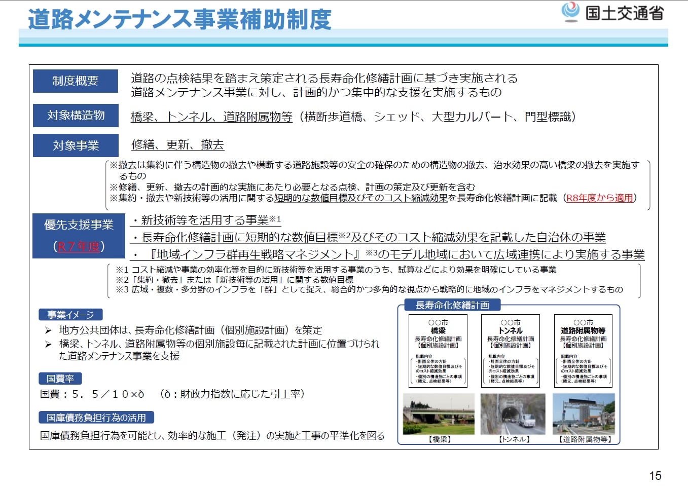 支援策の中でも、財政面は非常に重要です。「道路メンテナンス事業補助制度」では、長寿命化修繕計画にもとづく修繕、更新、撤去事業を支援しています。橋梁、トンネル、道路付属物が対象で、集約撤去や新技術を活用する事業については、優先的に支援しています。