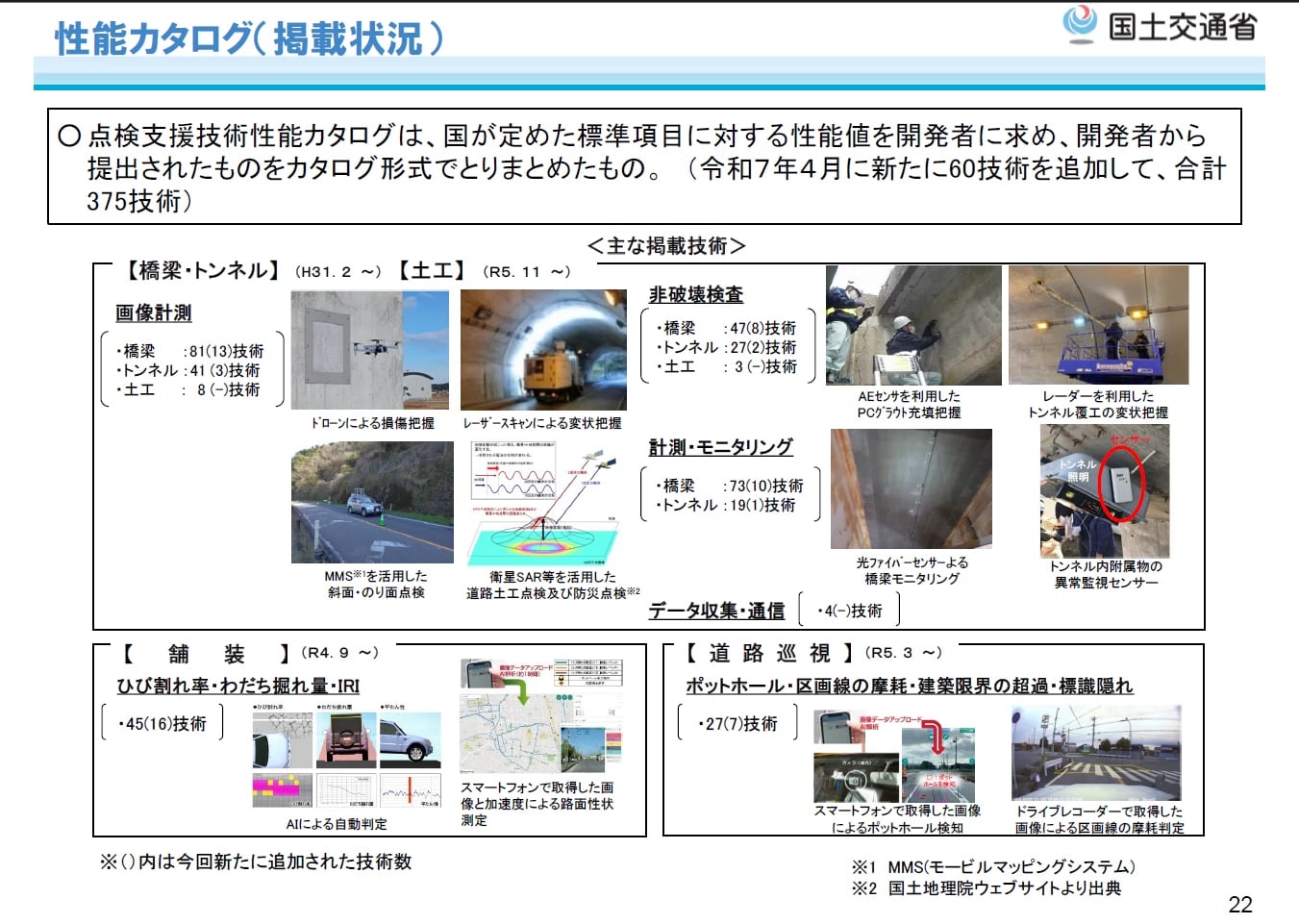 カタログには、各技術で何ができるのか、その精度や、性能を発揮する条件が整理されています。現場の状況に応じて、適切な技術を選択できるようにするためです。直轄国道では、点検が困難な箇所について、カタログ掲載技術の活用を原則化しており、地方公共団体への波及も期待しています。