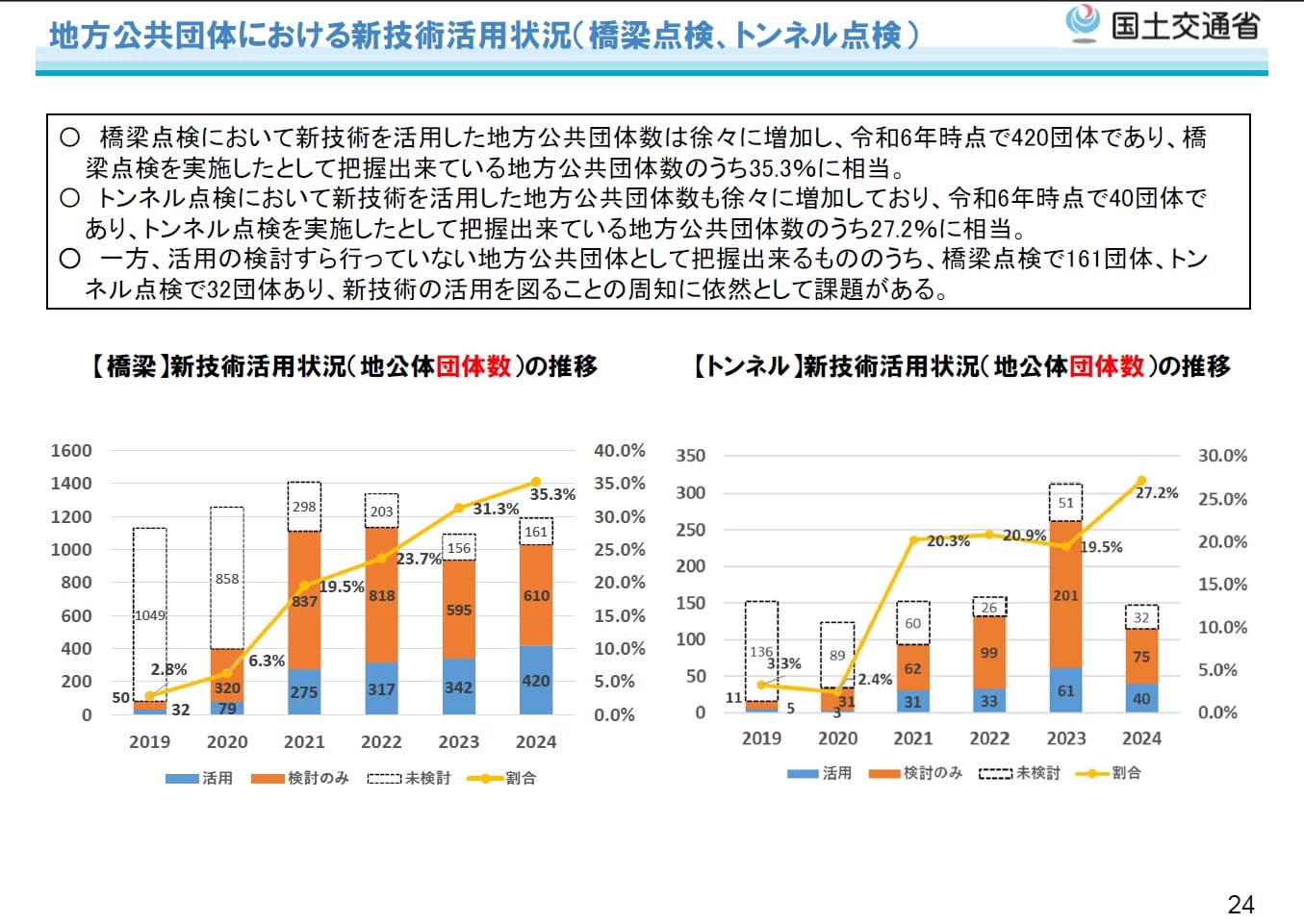 77条調査のデータを見ると、橋梁点検で新技術を活用した自治体は約35%、トンネルでは約27%となっています。一方、施設数ベースで見ると、直轄・地方ともに活用率は約8%程度にとどまっており、さらなる普及が課題です。