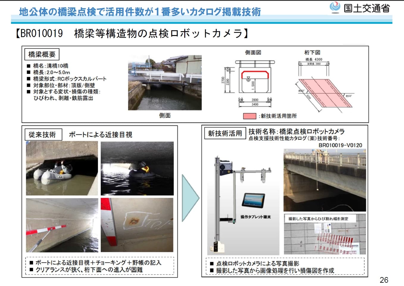 今回は自治体での活用件数が多い技術として、3つ紹介します。1つ目は橋梁点検ロボットカメラです。高所作業者やボートによる点検を代替でき、コスト縮減や工期短縮の効果が確認されています。