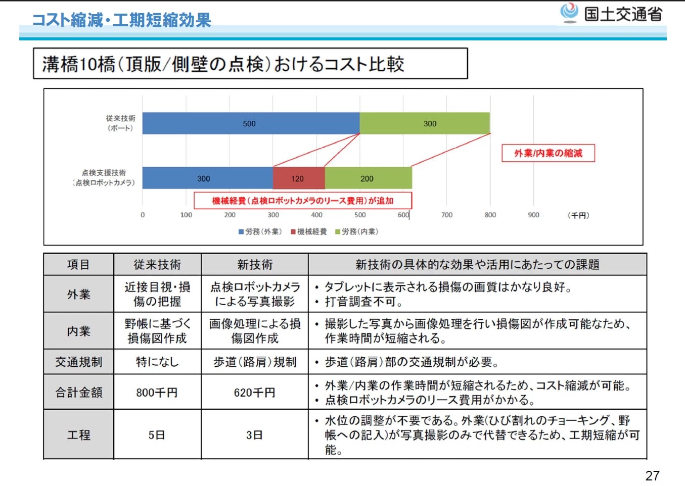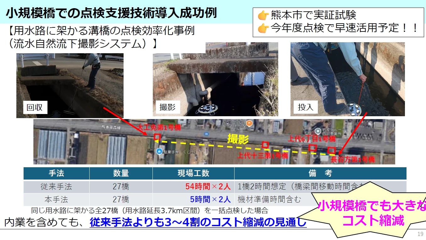 次に、熊本市で新技術導入によって大きな効果が得られた事例を紹介します。用水路にかかる小規模橋を対象に、上流側からカメラを流下させて一括撮影し、下流側で回収する方法です。用水路延長3.7km区間の27橋を一括点検した場合、従来手法(54時間×2人)に対して、本手法(5時間×2人)という現場工数の縮減が示されています。内業を含めても、3~4割のコスト縮減が見込まれると整理しています。