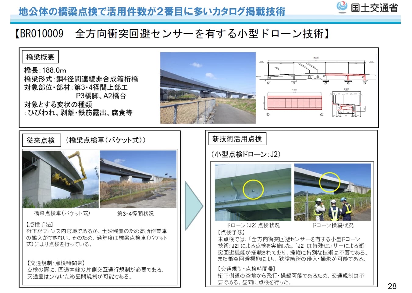 2つ目は、全方向衝突回避センサーを備えた小型ドローンです。近接目視と同等の診断が可能な場合には、ドローンによる代替が認められており、特に交通規制費用の削減効果が大きいと考えています。