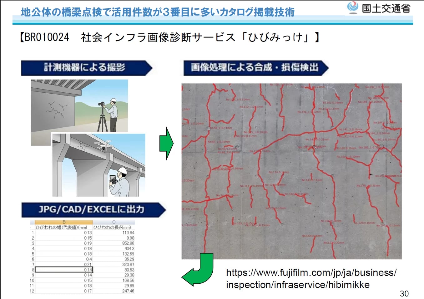 3つ目は、撮影した画像から損傷を自動抽出する画像診断サービス「ひびみっけ」です。内業の効率化にも寄与し、点検業務全体の省力化につながっています。