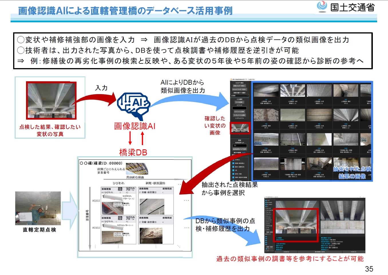 最後に、全国道路施設点検データベースについて触れます。点検結果や諸元を一元的に管理する仕組みで、APIを通じて第三者によるデータ活用も可能になっています。画像認識AIを活用し、類似損傷事例を検索するなど、診断支援に活用する動きも始まっています。