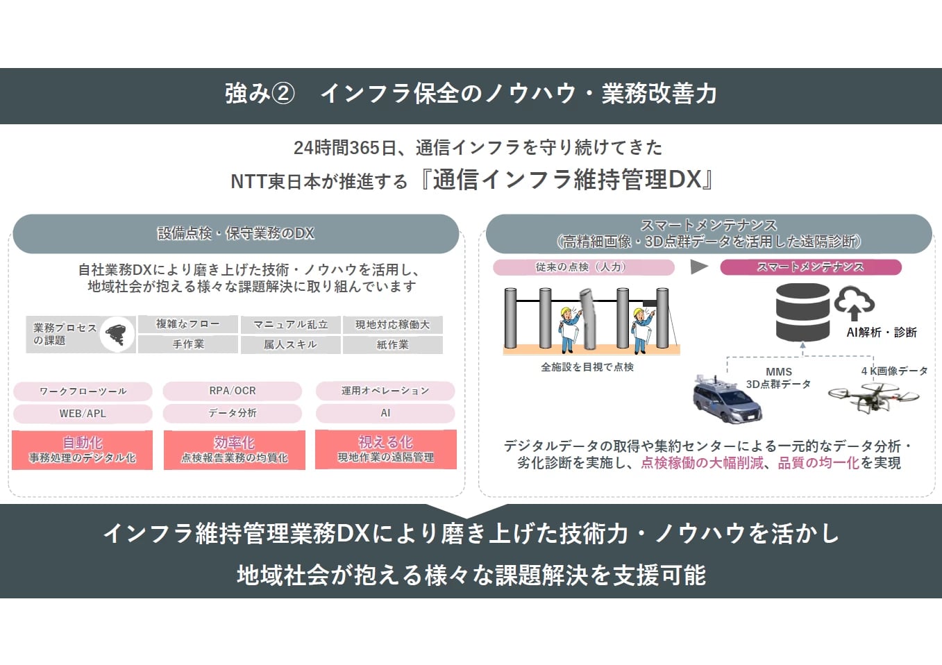 もう一つの強みは、膨大な通信インフラ設備の維持管理を長きに渡りDXしてきたノウハウです。業務プロセスの改善や品質の均一化、またデータを活用したスマートメンテナンス手法を早期に導入することで、点検稼働の大幅な削減を実現しています。弊社がたどってきた通信インフラ設備のDXは、まさに現在の自治体が直面している課題と同様であることから、弊社のDXノウハウが自治体の業務DXに活かせると考えています。