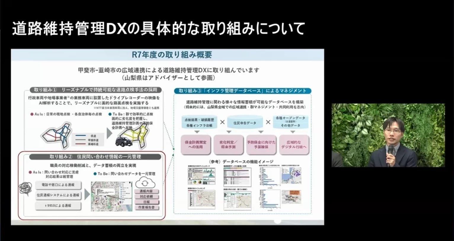 第2部に登壇したのは、NTT東日本株式会社の鈴木健太氏。NTT東日本が取り組む社会インフラ維持管理DXの取り組みについて、2025年からともにDXの取り組みを開始した、山梨県甲斐市建設課職員との座談を通して伺った。