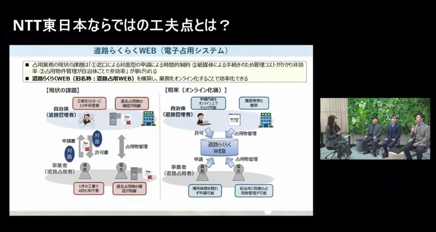 橋本:道路占用に関する申請手続きのデジタル化も進めています。NTTを含めインフラ事業者が道路管理者へ道路占用する際の手続きを効率化するためのシステムです。自治体さまに使っていただくことで、我々も自治体さまもオンラインで占用手続きが可能となります。