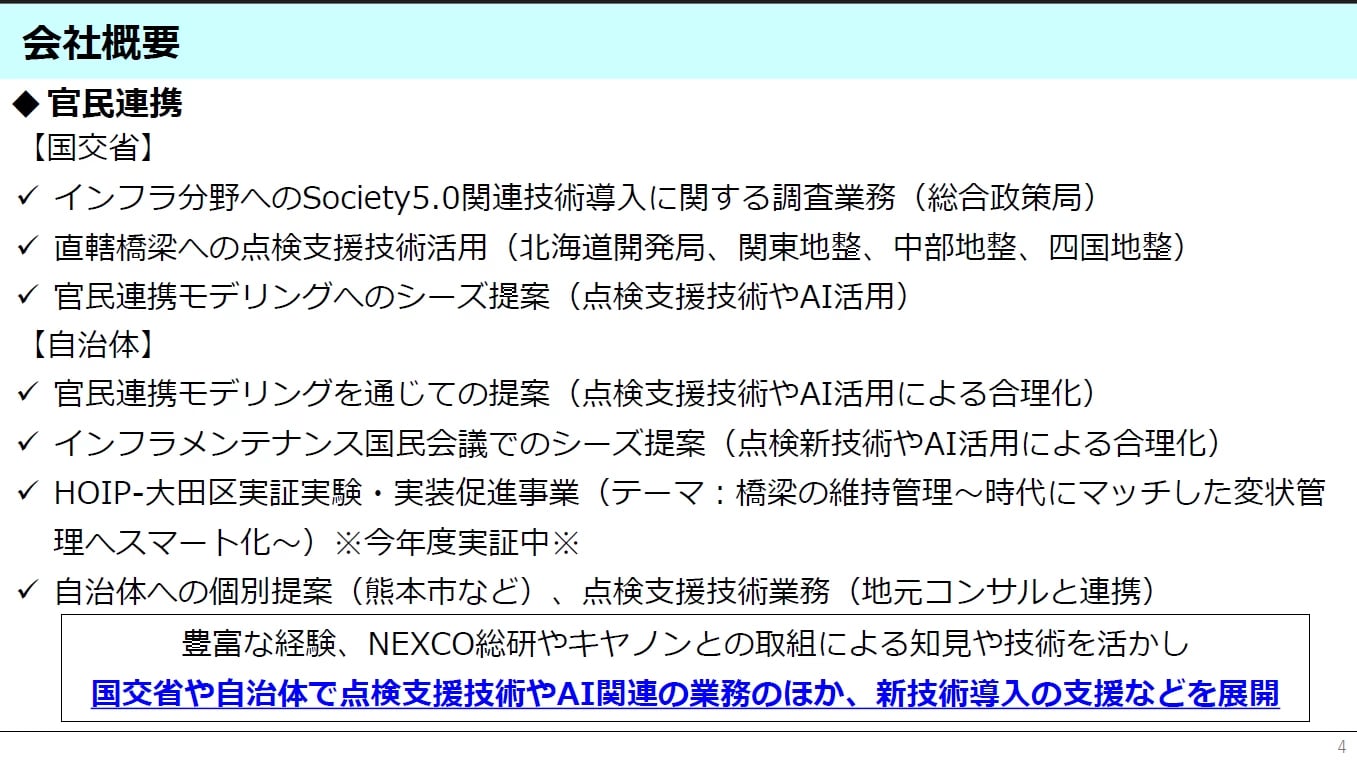また、官民連携にも力を入れています。国や自治体で、点検支援技術やAI関連の業務、新技術導入支援などにも取り組んできました。自治体向けには、地元コンサルタントとの技術交流を含めた形で支援を行うケースもあります。