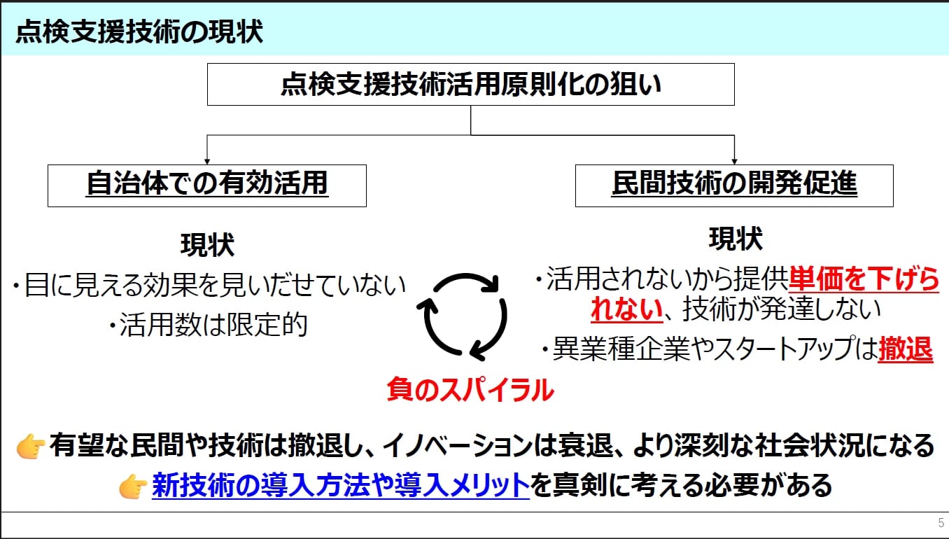 一方で現状を見ると、自治体側では「目に見える効果」を十分に見いだせず、活用が限定的になりがちです。民間側も発注が限られるためビジネスとして成立しにくく、単価を下げられない、技術が発達しにくいという状況に陥ります。その結果、点検支援技術やAI技術が割高な状態のまま使われるケースが増えます。さらに、有望な技術を持つ企業が維持管理市場から撤退し、イノベーションが衰退するという危機につながります。私自身、民間の立場として、この状況は想像以上に深刻だと感じています。