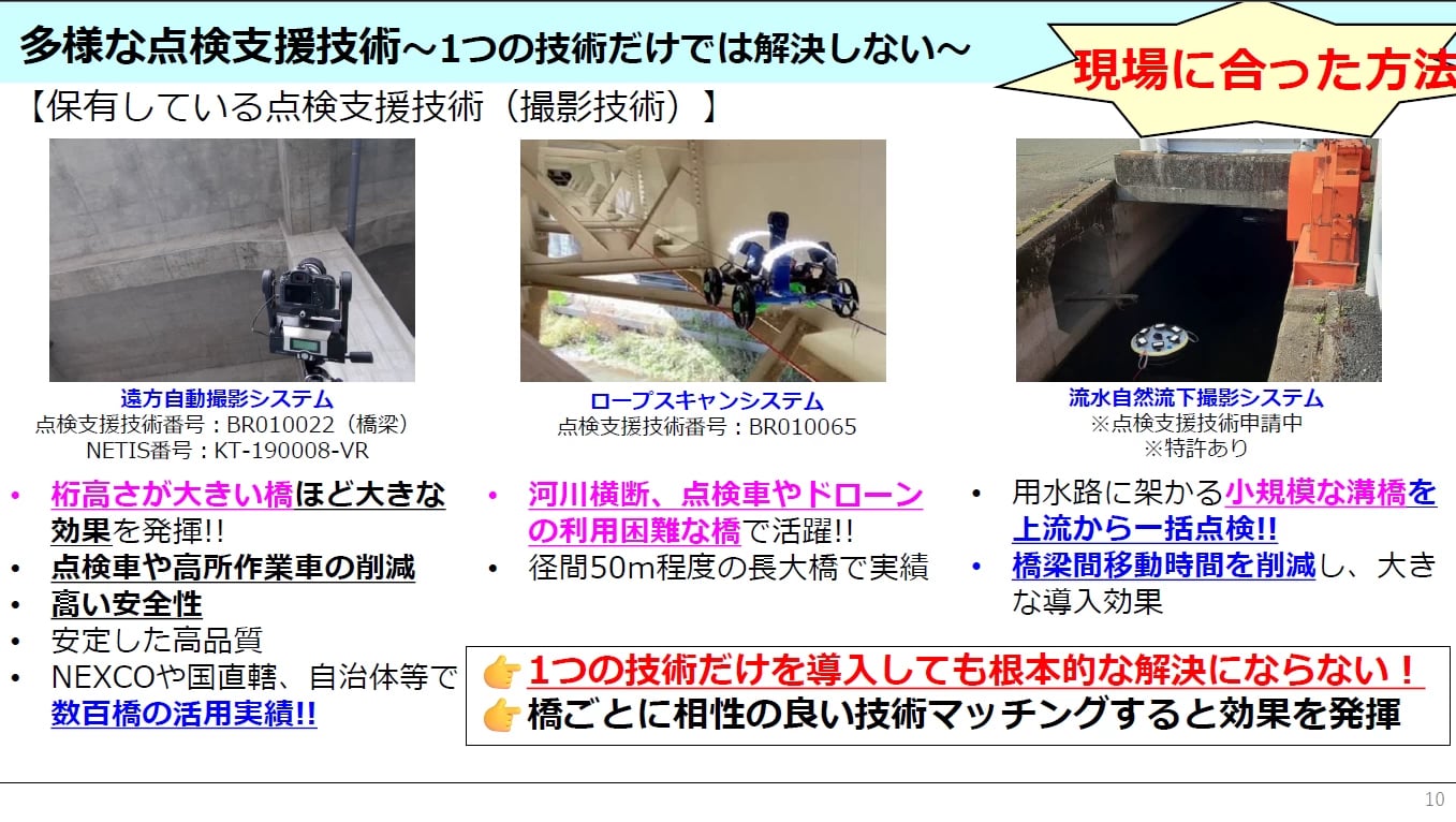 ここで重要なのは、一つの技術だけを導入しても根元解決になりにくいという点です。橋ごとに相性の良い方法をマッチングさせ、より多くの橋で活用することで、スケールメリットを高めていきます。