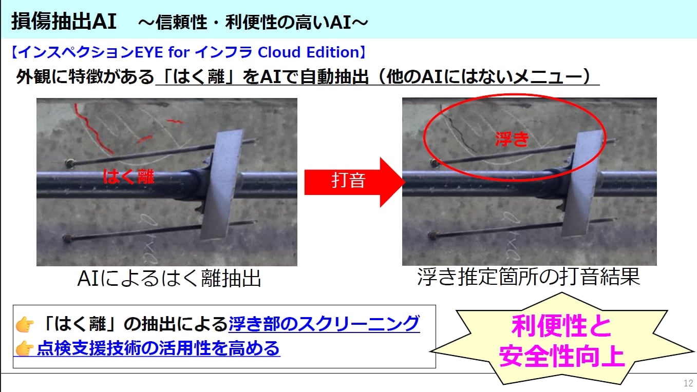このAIは、ひび割れだけでなく、鉄筋露出など多様な損傷種類に対応しています。また、外観に特徴のある「はく離」を自動抽出し、浮きの可能性がある箇所を打音でスクリーニングするといった活用にもつながります。点検支援技術の合理的な活用に貢献できると考えています。