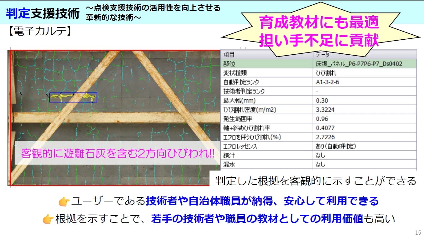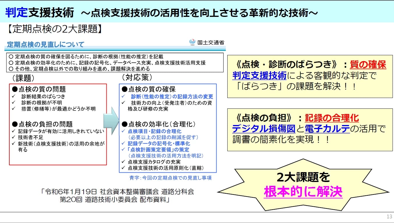 今回紹介している技術の目玉となるのが判定支援技術です。定期点検では「点検・診断のばらつき」と「点検の負担(記録の合理化)」が大きな課題とされています。判定支援技術は、この二つの課題を根本的に解決することを目指した技術です。