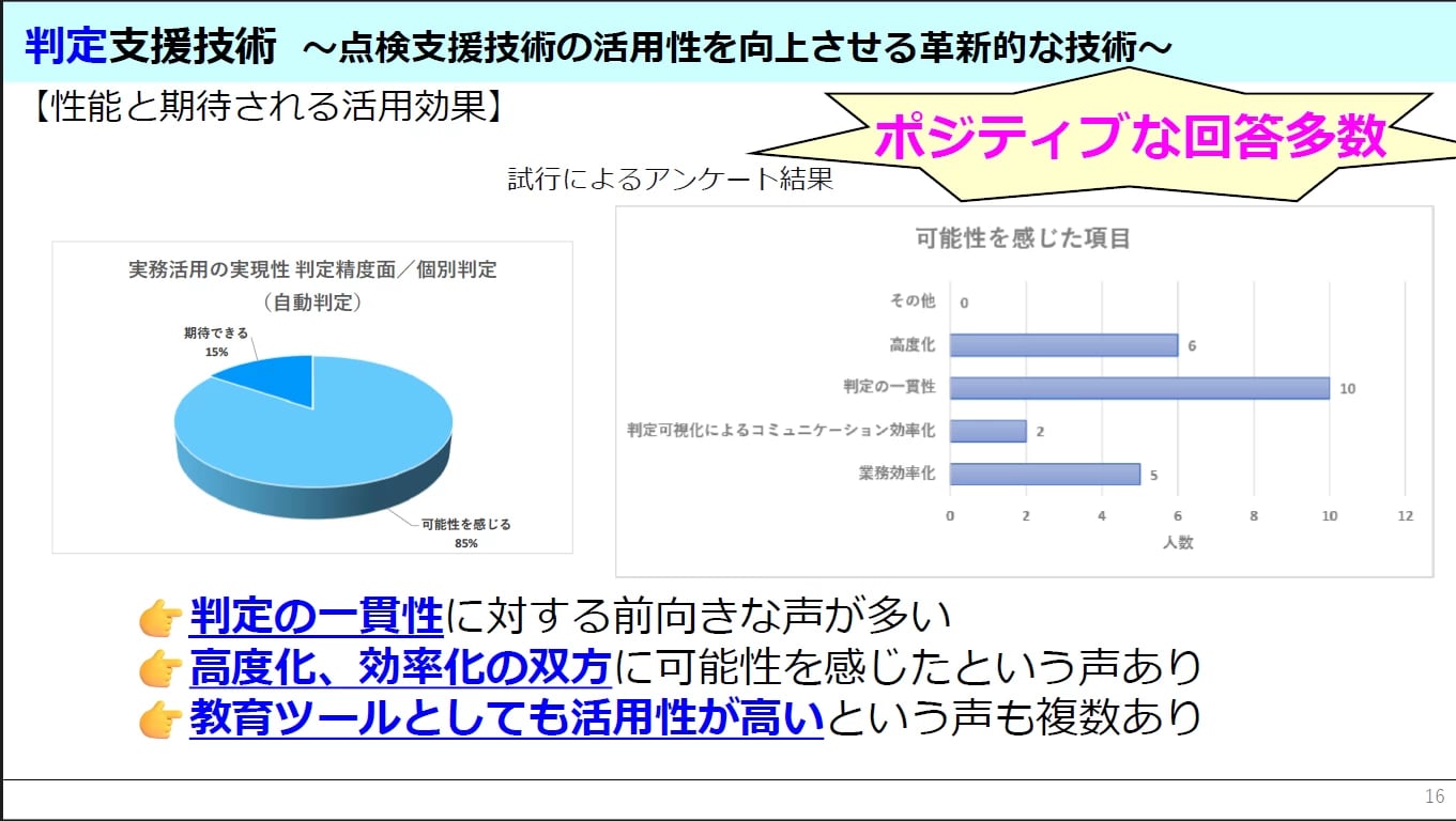 試行時のアンケートでも、性能面に関して前向きな回答が多く、判定の一貫性や効率性の観点でもポジティブな評価が得られています。