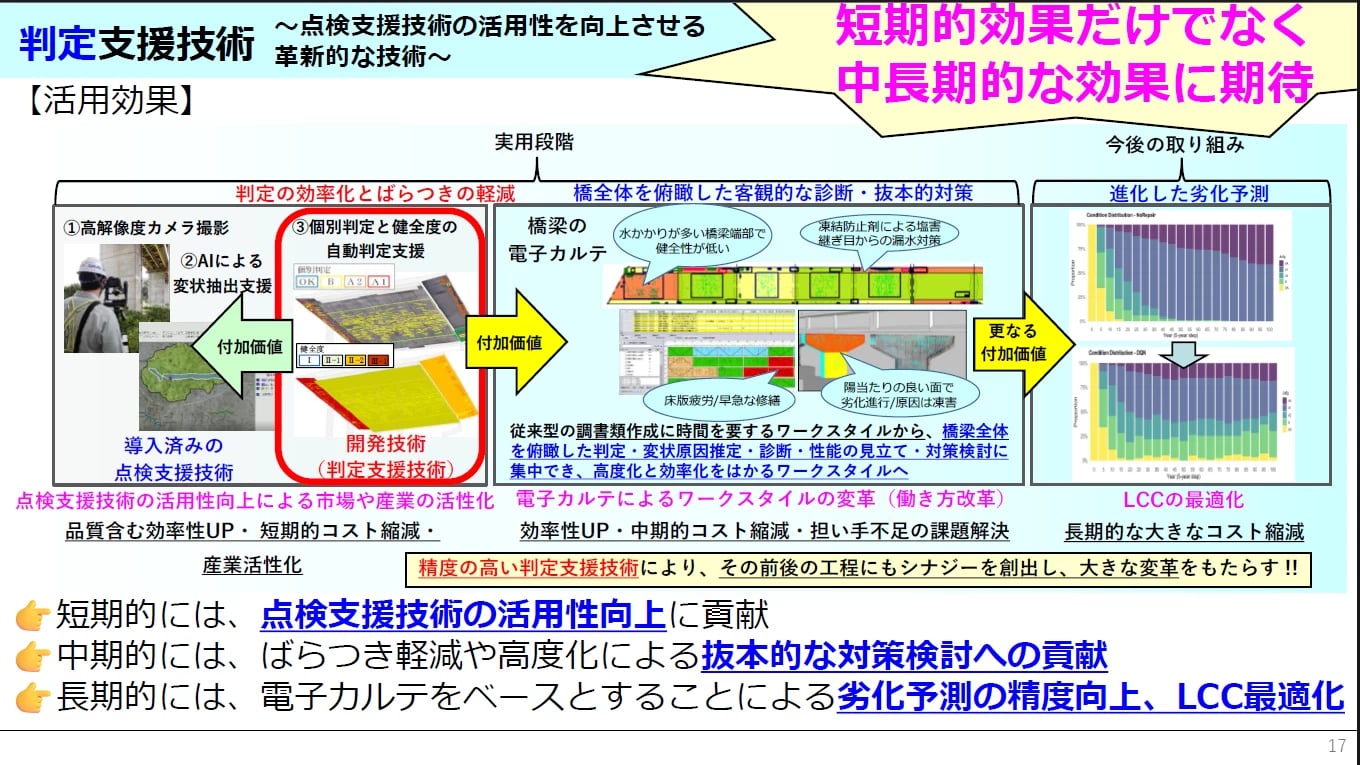 導入効果は短期・中期・長期で整理できます。短期的には点検支援技術の活用性向上に寄与します。中期的には、ばらつきのない判定が可能になることで、抜本的な対策検討に貢献します。長期的には、電子カルテをベースに信頼性の高いデータを蓄積し、劣化予測の精度向上やLCC最適化による大きなコスト縮減につなげることを期待しています。