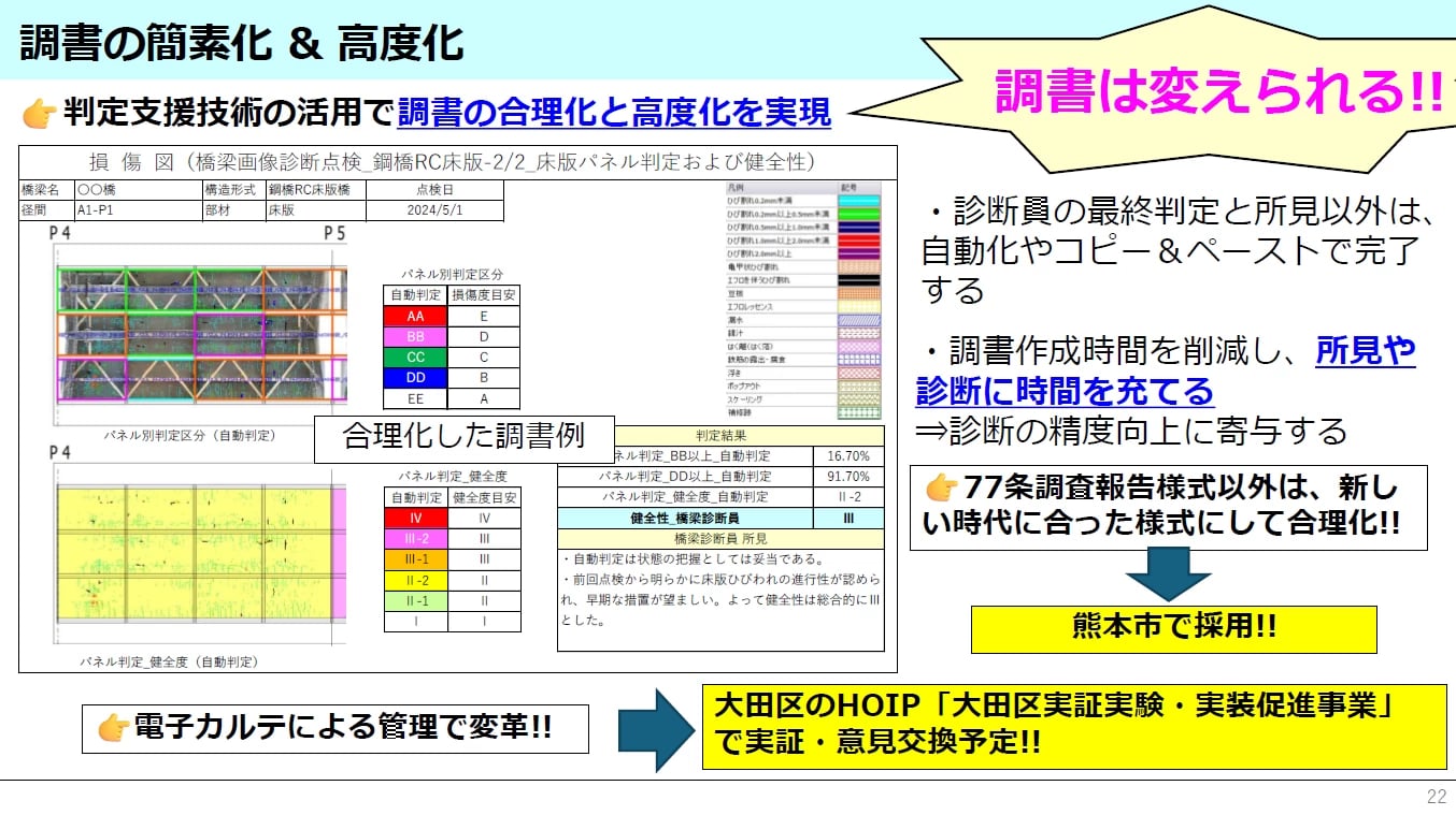 大田区と協定を結んで行った実証実験では、個々の損傷判定や健全度について、技術者の判定と同様の判定が出ることが実証されています。また、自治体や直轄国道の橋梁などでも試行しており、適応性が高いことを確認しています。