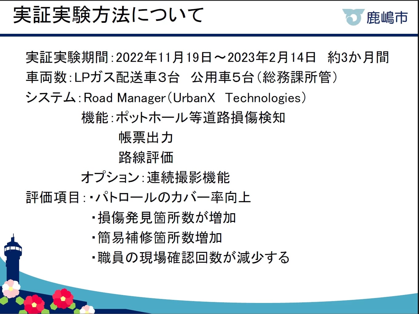 期間は2022年11月19日から2023年2月14日までの約3カ月間です。車両はLPガス配送車3台、公用車5台(総務課所管)を使用。システムはUrbanX Technologiesの「Road Manager(RM)」を利用し、ポットホールなどの道路損傷検知、位置と写真を帳票として出力する機能、損傷数を可視化する路線評価などを活用しました。加えて、損傷部だけでなく全ての写真を確認できる連続撮影機能のオプションも使いました。