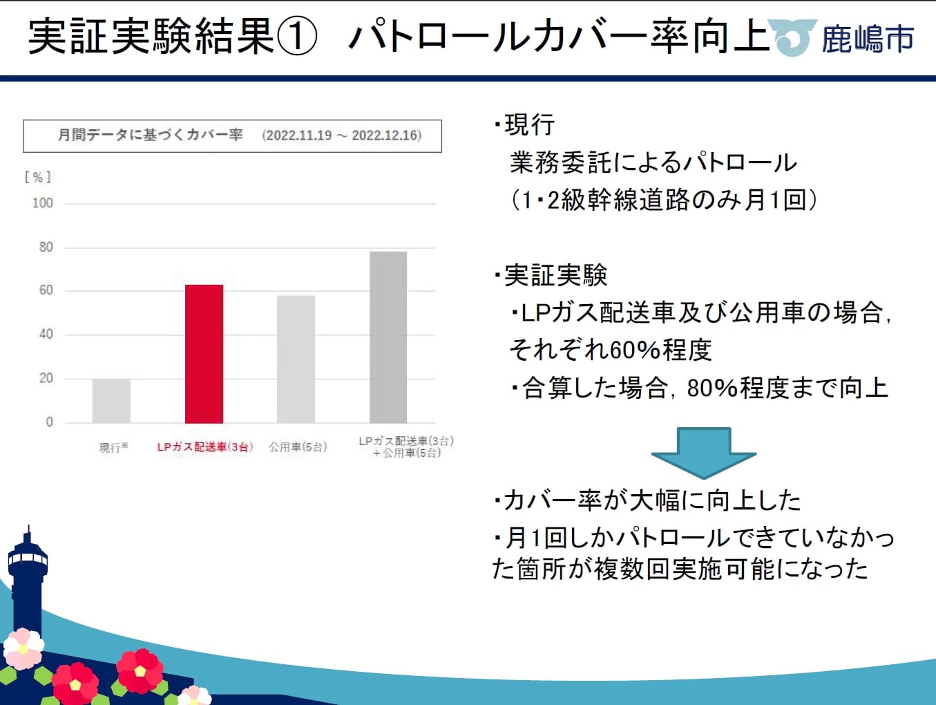 実証結果の1つ目は、パトロールカバー率の向上です。実証実験では、LPガス配送車と公用車それぞれで60%程度、合算すると80%程度までカバー率が向上しました。月1回しかパトロールできていなかった箇所を複数回実施できるようになり、面的なカバーと頻度の両方が改善した点が成果でした。