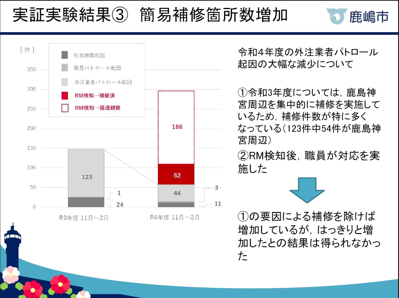 3つ目は、簡易補修箇所数です。令和4年度は外注業者パトロール起因の大幅な減少がありましたが、その背景として、令和3年度は鹿島神宮周辺を集中的に補修しており、補修件数が特に多かったことが挙げられます。また、Road Manager検知後に職員が対応を実施した点も整理しています。こうした要因を踏まえると、増加傾向は見られるものの「はっきりと増加した」という結果までは得られませんでした。