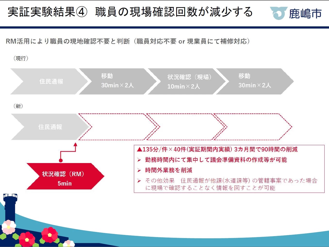 4つ目は、職員の現場確認回数の減少です。連続撮影機能で要望箇所の写真を確認できるため、現地に行かなければならない回数を減らすことができました。住民通報を受けたら、まずRoad Manager上で該当箇所の写真がないか確認し、写真から状況が分かり対応指示可能なものは現地確認を省く、という流れに変更しました。資料では、実証期間3カ月で40件の現場確認を削減し、合計90時間の削減につながったと整理しています。