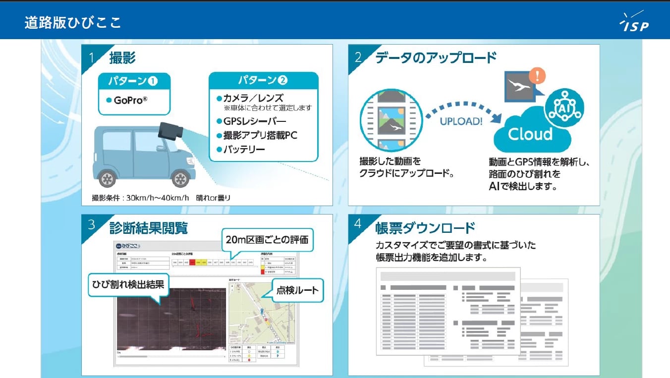 この道路版の仕組みは、高速道路のように大型の検査車両や精密機器を入れて定期的に検査できる環境ではなく、いわゆる生活道路など、大掛かりな設備による検査が難しい道路でのアプローチとして位置づけています。まずは画像で見つけ、問題がありそうなら人が見に行く、という流れにすることで、完全な自動化が難しくても、点検の高度化につなげたい、という考え方です。