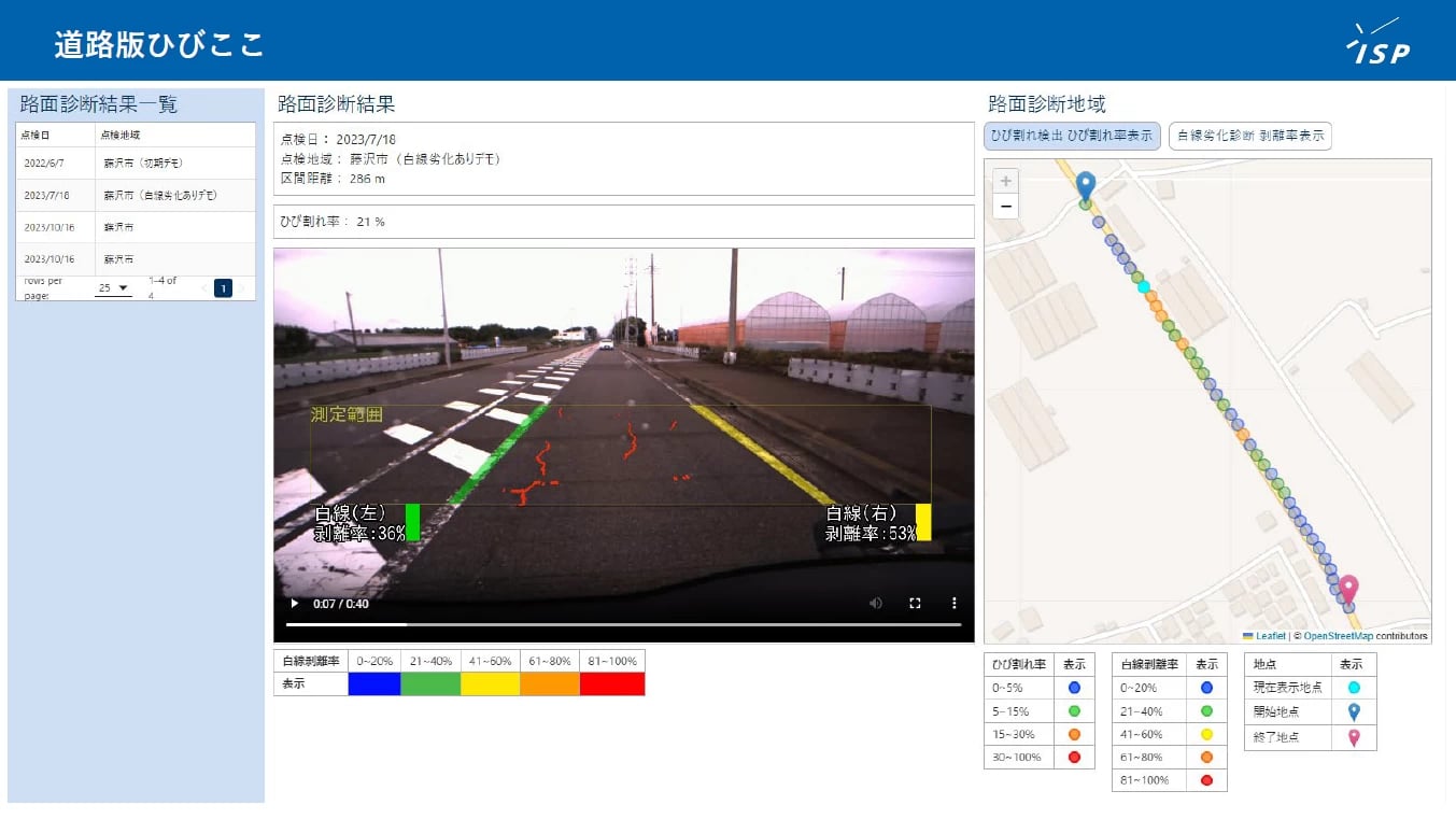道路版ひびここでは、車両にアクションカメラとGPSを搭載し、走行しながら路面を撮影します。撮影データをアップロードすると、クラウド側でひび割れ箇所を検出し、結果を画面で確認できるようにします。点検ルートと撮影位置が分かる形で表示し、区画ごとの評価を出すことで、場所と劣化状況を紐付けて見える化します。さらに、要望に応じて帳票としてダウンロードできる形にもします。