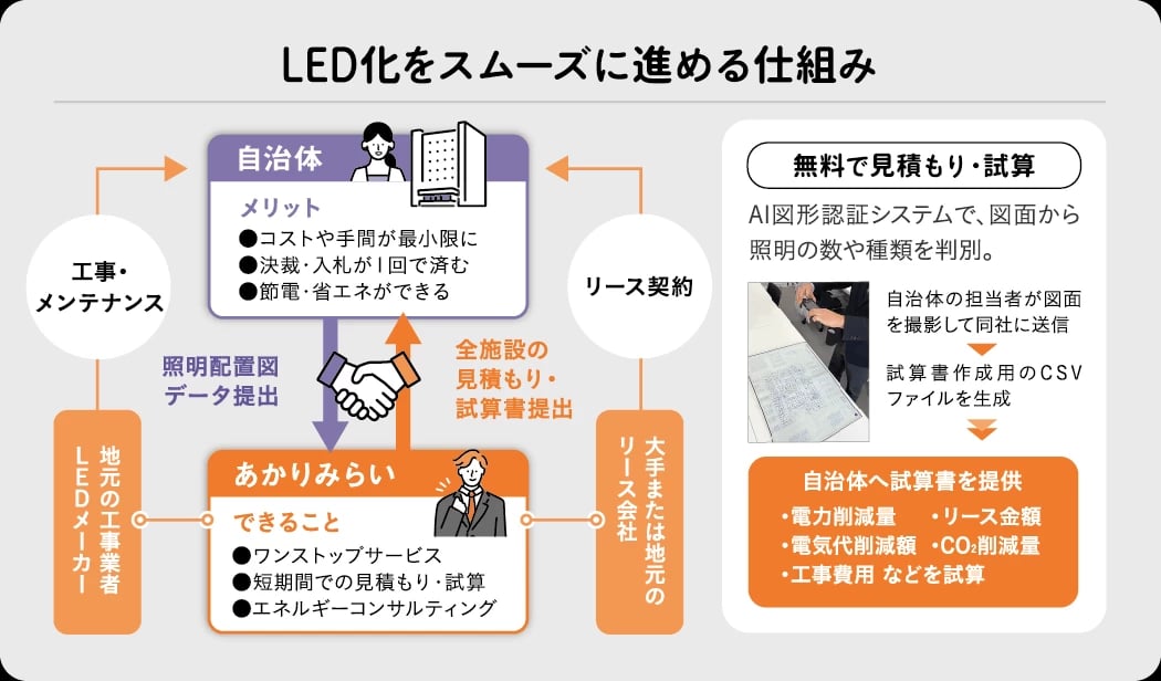 施設の所管課ごとに取り組むのではなく、組織を横断し、全施設を一括してLED化すれば、短期間のうちに効率よく工事を終わらせることができます。さらに長期リースを活用すれば、支払いは分割です。照明の数が膨大になると、見積もりが大変ですが、自治体担当者は、照明配置図をスマホで撮影して当社に送るだけ。その画像から、自社開発のAI図形認証システムが照明の種類や数を識別し、数日で見積もりを出します。工事費用は民間相場で算定するため、公共単価の約3分の1に。LEDへの転換で、約7割の節電効果が見込め、浮いた電気代をリース費用に充てられます。電気使用量・電気代・CO2の削減見込みなども提示するので、検討しやすくなるのではないでしょうか。年度の早い段階で補正予算を組み、着工した自治体もあります。スケジュール策定などもサポートするので、相談してください。