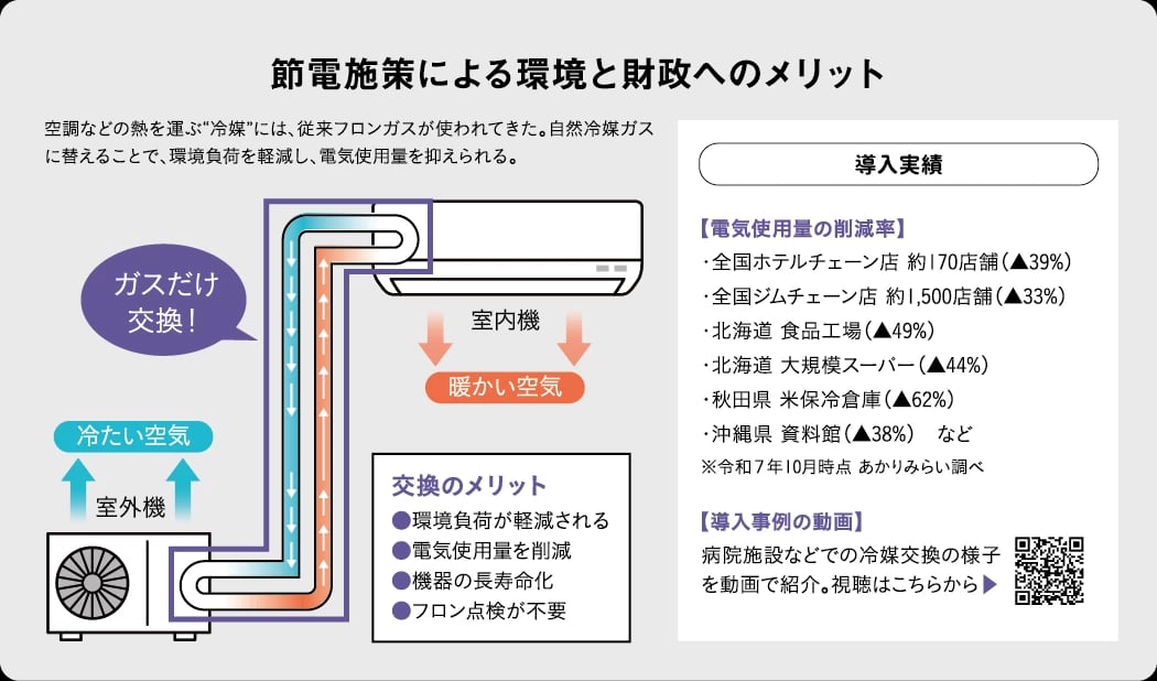 照明に並び、光熱費の多くを占める空調での節電施策をオススメしています。設備交換ではなく、熱を運ぶ“冷媒ガス”を従来のフロンガスから炭化水素系の自然冷媒ガスに交換するのです。このガスは、フロンより分子が大きくて軽いため、機器への圧力を抑制。3~6割の消費電力を削減し、CO2排出量も減らせるため、脱炭素施策としても非常に有益です。世界的な脱フロンの流れの中で、日本でも進みつつある手法です。