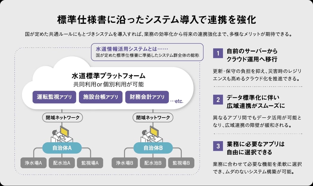 同システムは、国の標準仕様にもとづき、水道事業に関わるデータをクラウド上で一元管理できる仕組み。標準仕様に対応したプラットフォームと業務アプリを導入することで構築できる。アプリには財務会計アプリなどがあり、自前のサーバーからクラウドに移ることで、広域連携が進めやすくなる点がメリットだという。「この仕組みであれば、データが標準化され、異なるアプリ間でもデータが連携できます。また従来は、特定のベンダーへ依存していました。その点、複数ベンダーが提供しているため、競争原理が働きコストダウンにもつながります」。