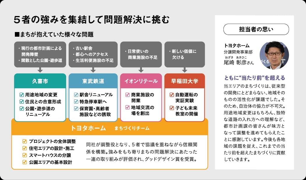 まちづくりが動き出したのは平成29年。約9.5haの土地を所有していた鉄道会社から、土地利用を促進したいという相談が同市に寄せられた。「私たちも未利用地を課題と捉えており、何とかしたい思いがありました」と宮下さん。具体的な協議を進める中で、鉄道会社が声をかけたのが「プライム ライフ テクノロジーズ(PLT)」グループ傘下の「トヨタホーム」まちづくりチームだ。さらに大手小売事業者も加わり、住宅地と商業施設・生活利便施設を含めた、複合的なまちの将来像を描いていった。「しかし、用途地域などの都市計画制限により、実現が難しかったのです」。