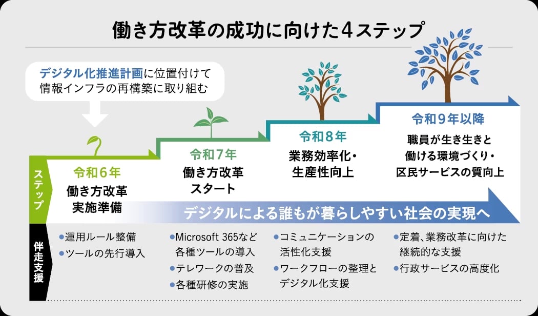 同社の提案内容は大きく4つのステップに分けられる。まず準備期では現場の状況を把握し、導入するツールを検証。次にツールを導入し、職員の利用促進をサポート。習熟度が高まった段階で、業務の見直しや効率化に向けた支援を実施する。最終的には、職員がより意欲的に働ける環境を整え、区民サービスの向上につなげる、という流れだ。