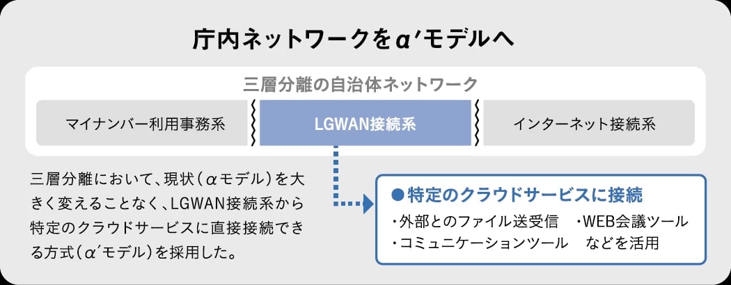 庁内ネットワークの構成は、協議の結果「α′(アルファダッシュ)モデル」を採用することに決まった。「職員の使いやすさや再構築までのスピード、今後の自治体ネットワークへの適合などを総合的に考え、これが最適だと判断しました」。こうして、プロジェクトの土台が固まっていった。