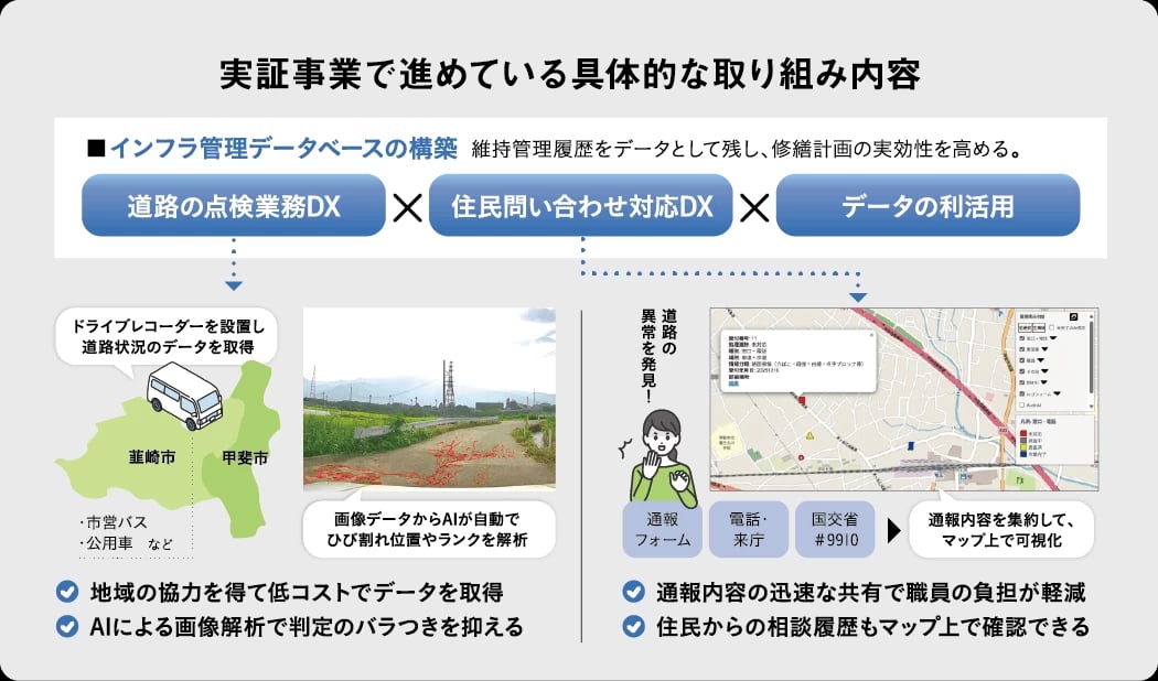 実証事業は3つの軸で構成されている。まず“道路の点検業務DX”では、市営バスや公用車にドライブレコーダーを取り付け、録画データを回収。それをAIで解析し道路の穴やひび割れなどを検出する。次に“住民問い合わせ対応DX”では、住民からの通報をデジタルで一元管理し、可視化することで業務の効率化を図る。そして“データの利活用”では、収集した情報を効果的に分析できる仕組みを構築し、道路の劣化状況の把握や今後の修繕計画に活かしていくというものだ。