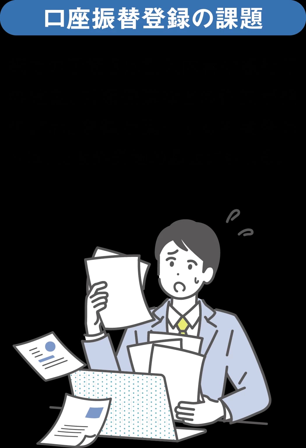 「口座振替の登録申請は紙ベースなので、申請用紙の目隠しシールを剝がしたり、記入内容や捺印の確認をしたり、様々な手作業が発生します。申請が集中する4~6月は、夜遅くまで作業する日も少なくありません。記入不備や印鑑間違いによる差し戻し対応にも、時間とコストがかかっていました」と鈴木さんは振り返る。また、納付書の紛失などによる納付忘れが続くと債権回収や差し押さえの対応も必要になるため、さらに事務負担が増えることも課題だったという。