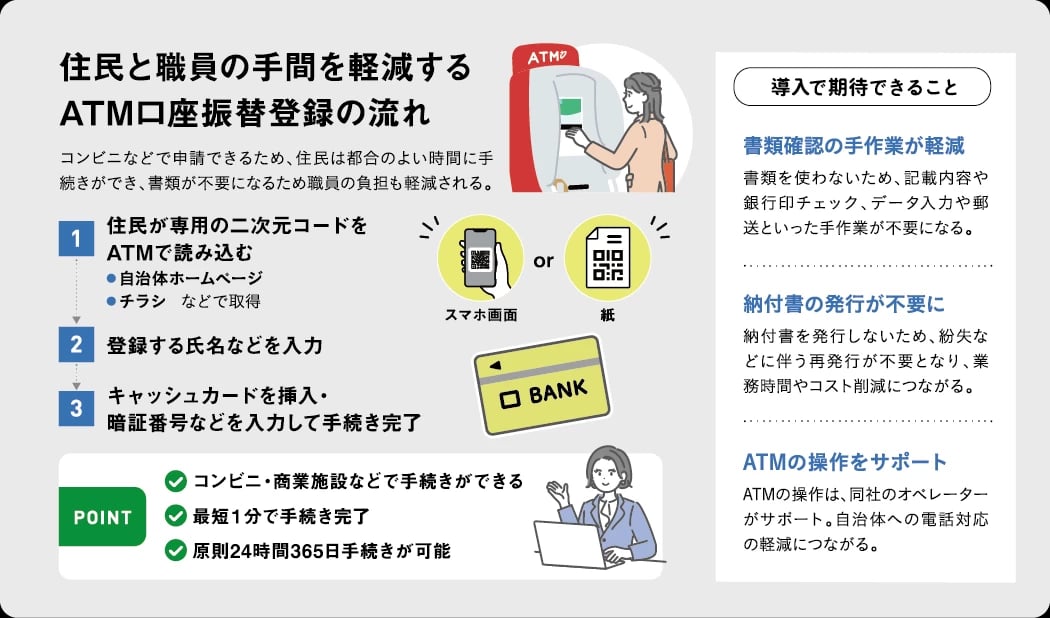 同サービスはペイジーを利用したもので、コンビニや商業施設にあるセブン銀行ATMで口座振替の登録ができる。まず自治体が専用二次元コードを作成し、ホームページへの掲載や、チラシへの印字で住民に案内。住民はそのコードをATMで読み込み、希望する税目を選択。その後、銀行口座のキャッシュカードを挿入し、暗証番号などを入力して申請が完了する。自治体は管理画面で申請情報を確認できる。