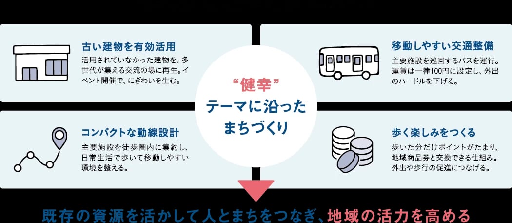 健康を軸に市民の交流を広げ、まち全体のにぎわいへつなぐ。