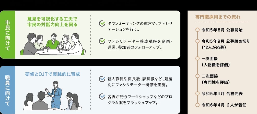 そこで同市は令和5年8月から外部人材の公募を開始。最長5年の任期付きで募集すると、42人の応募があったという。「公募について、当市の広報紙やホームページで発信。その情報がファシリテーターのコミュニティで話題になり、多くの応募につながったと聞いています。採用で重視したのは、円滑なコミュニケーションが取れること、そしてファシリテーション能力と指導力の高さです」。一次面接では人物像や組織との相性を確認。二次面接では、タウンミーティングを想定したプログラム案の作成とプレゼンテーションで、専門性を評価した。内容については外部の学識経験者や市の外郭団体から、ファシリテーションの知見をもつ人材も同席し、評価できるよう工夫したという。