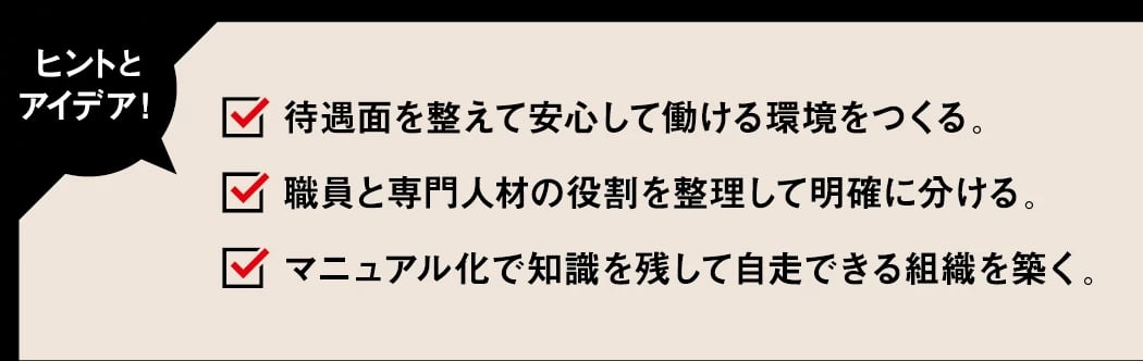役割分担と知識を残す仕組みで専門人材の効果を持続させる。