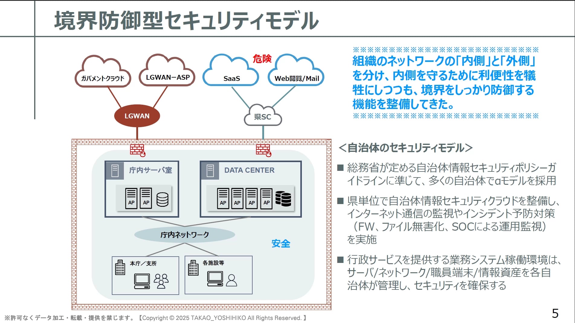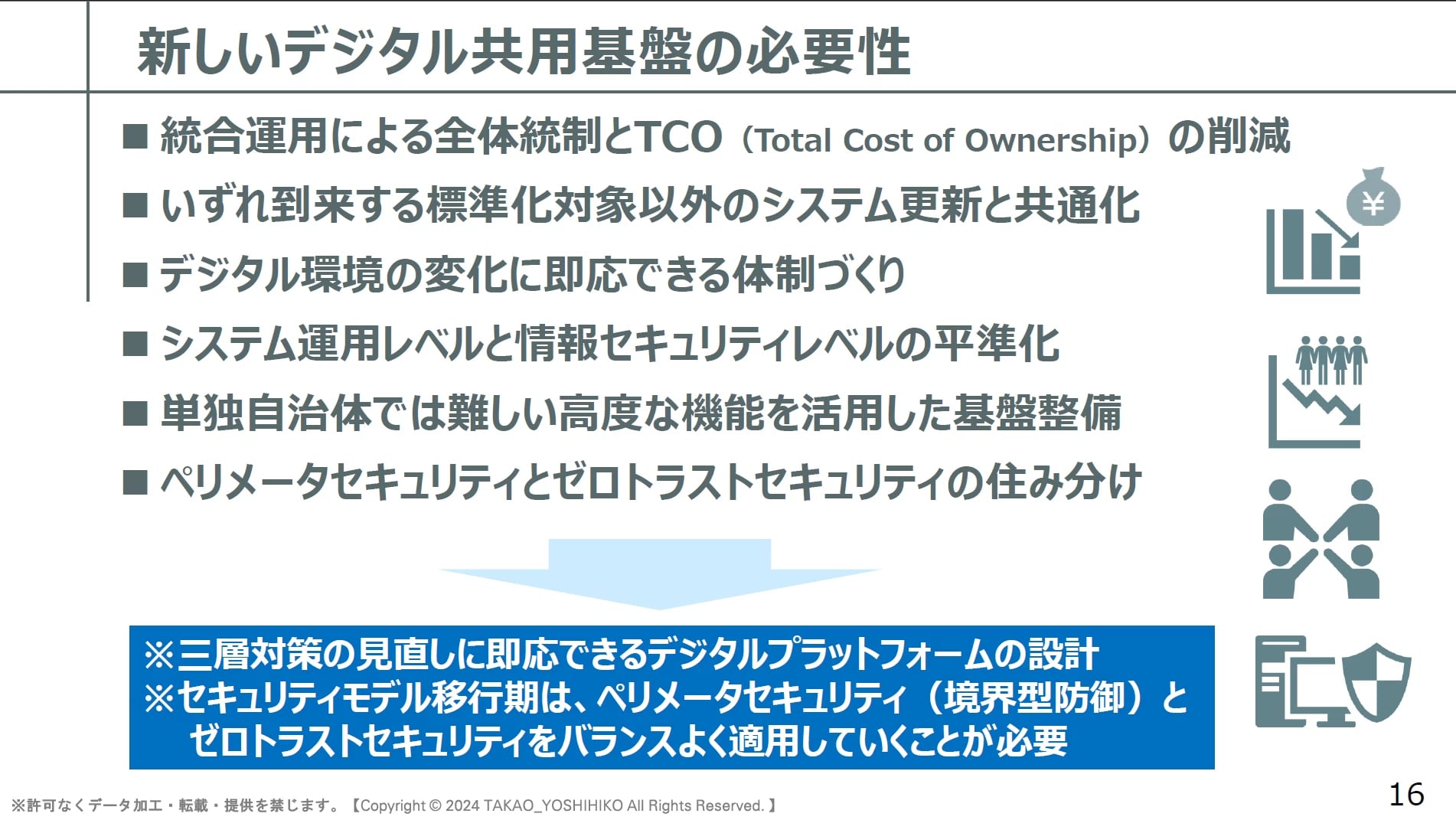 こうした課題を踏まえ、私は新しいデジタル共用基盤が必要だと考えています。統合運用による全体統制とTCO削減、標準化対象以外のシステム更新や共通化、変化に即応できる体制づくり、運用レベルや情報セキュリティレベルの平準化などを進めたいからです。さらに、単独自治体では難しい高度な機能を活用した基盤整備も必要です。セキュリティモデルの移行期には、境界防御(ペリメータ)とゼロトラストをバランスよく適用していく発想が重要だと思っています。