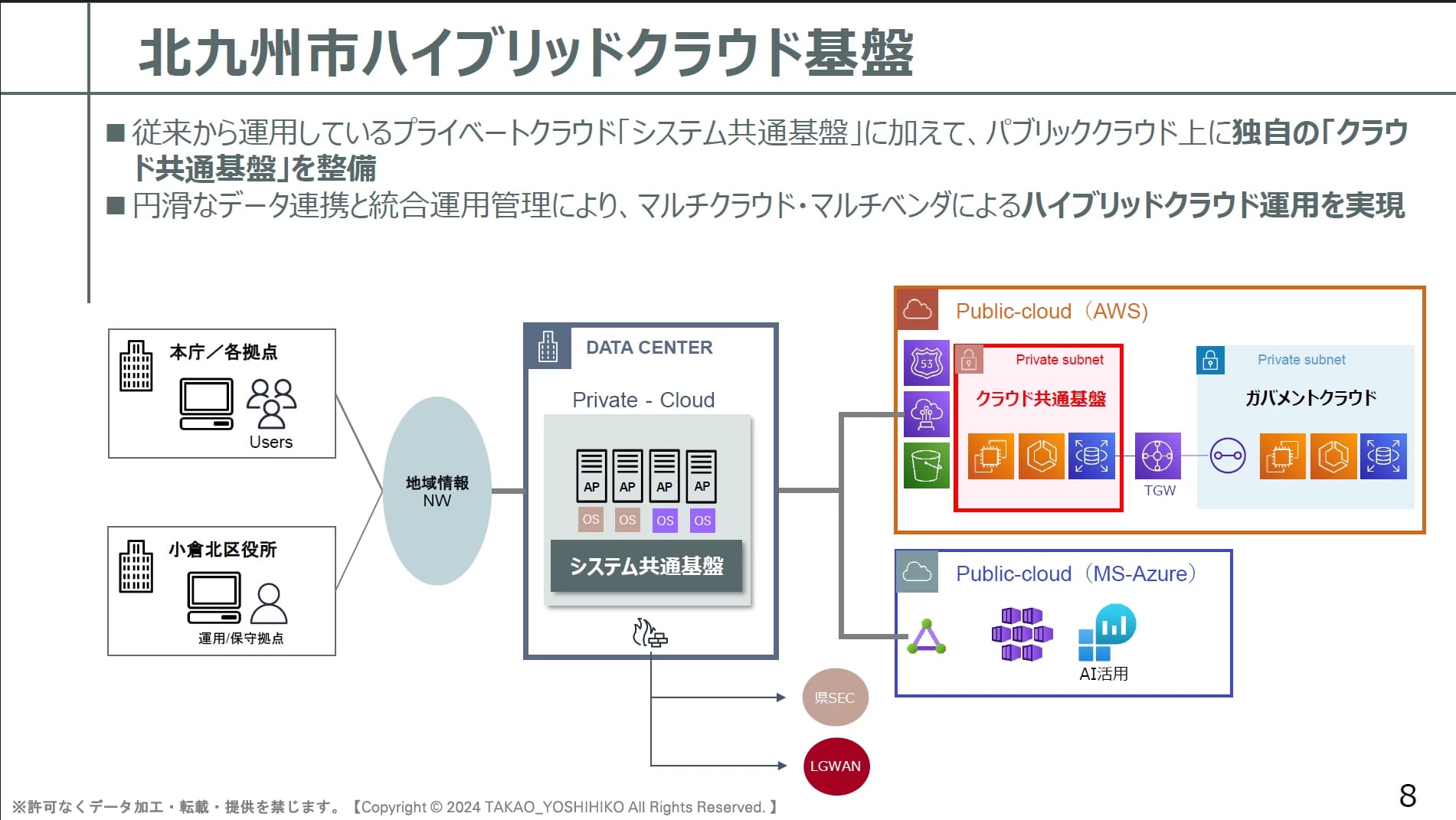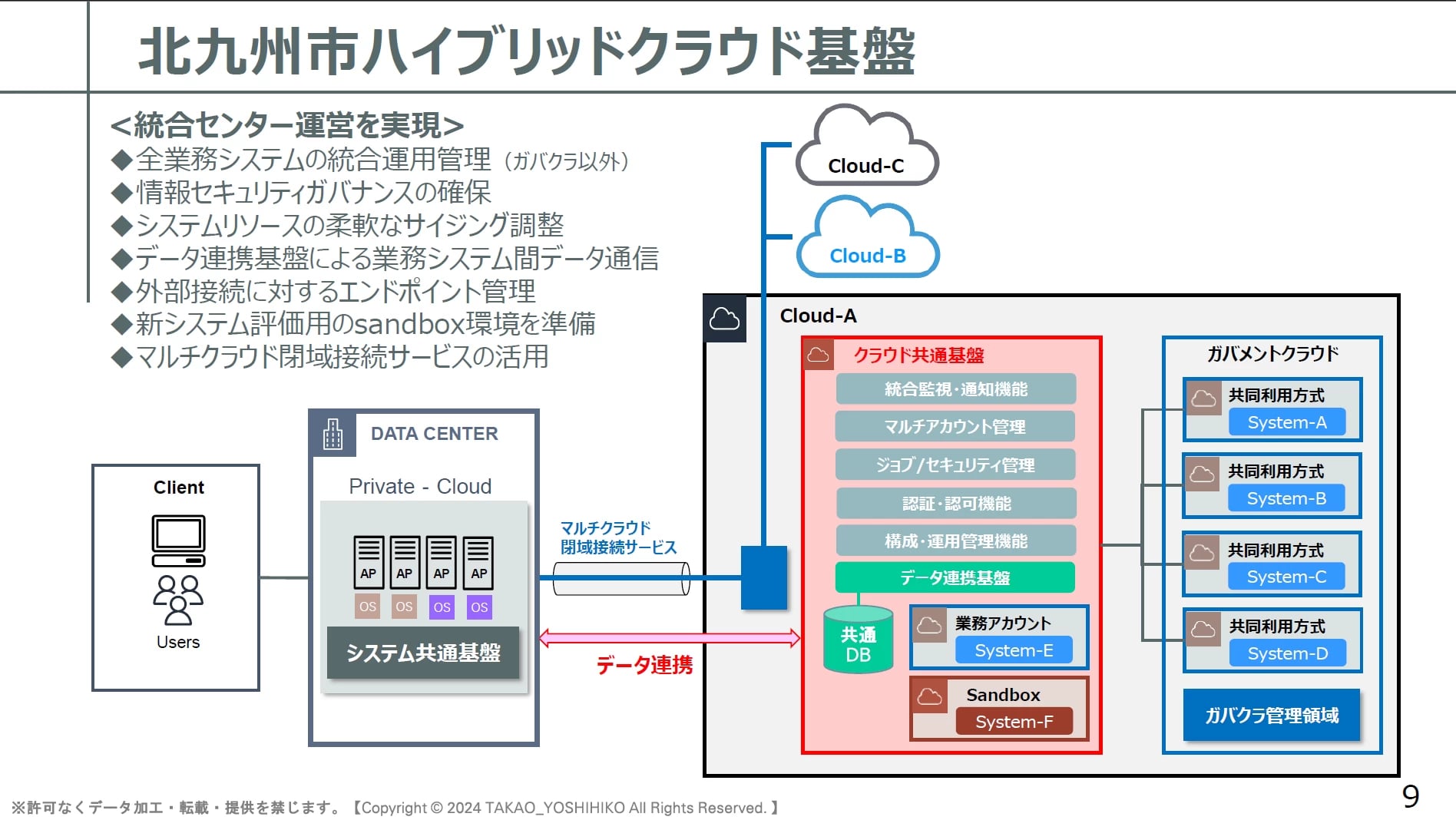 北九州市では、以前から運用しているプライベートクラウド(システム共通基盤)をデータセンターに配置し、多数のシステムを運用してきました。一方で、標準化の流れに伴い、ガバメントクラウドへ移行するシステムも出てきています。そこで、閉域接続サービス等を活用し、クラウドまで基盤を延伸させた「北九州市ハイブリッドクラウド基盤」を運用しています。