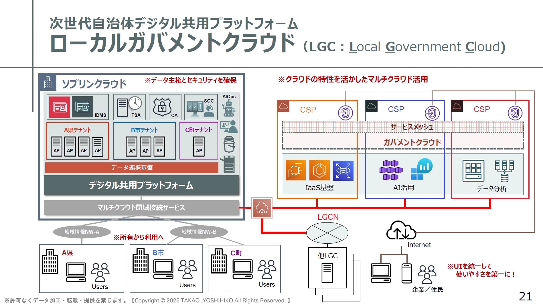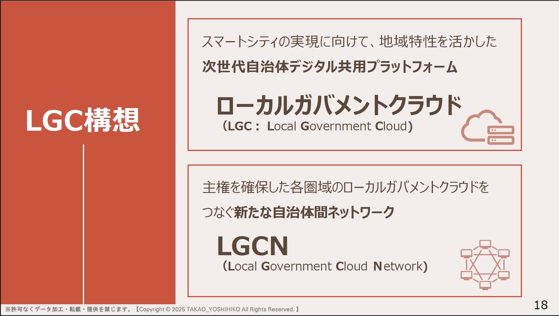 今回の本題であるローカルガバメントクラウド構想(LGC)は、地域特性を生かしたローカルなガバメントクラウドを地方拠点として整備し、それらをつなぐ新たな自治体間ネットワーク(LGCN)を構築する考え方です。データ主権や運用管轄権を確保し、為替の影響を受けない「ソブリンクラウド」を中心に国内クラウドの利用を推進します。職員IDと市民IDを管理する統合ID管理機能を搭載し、主にG2Cサービスを提供していきます。