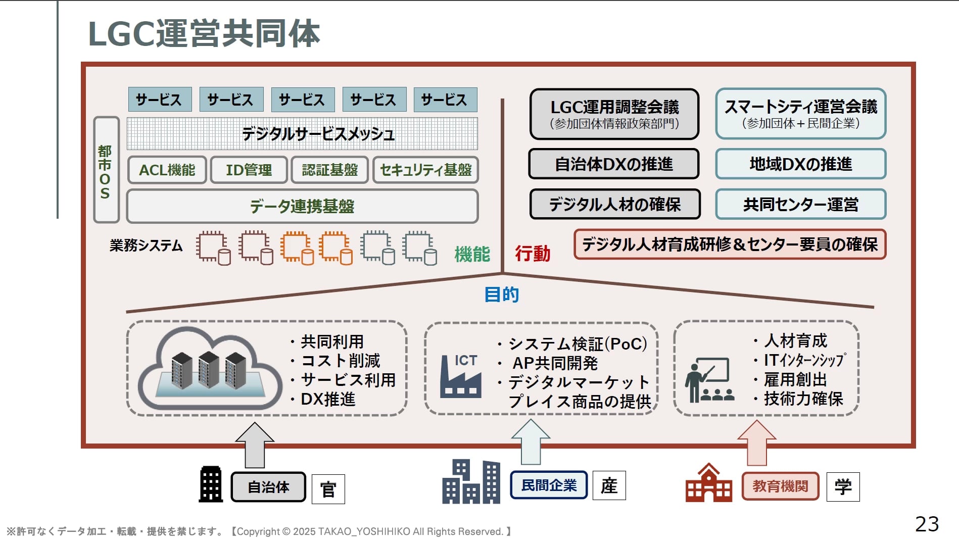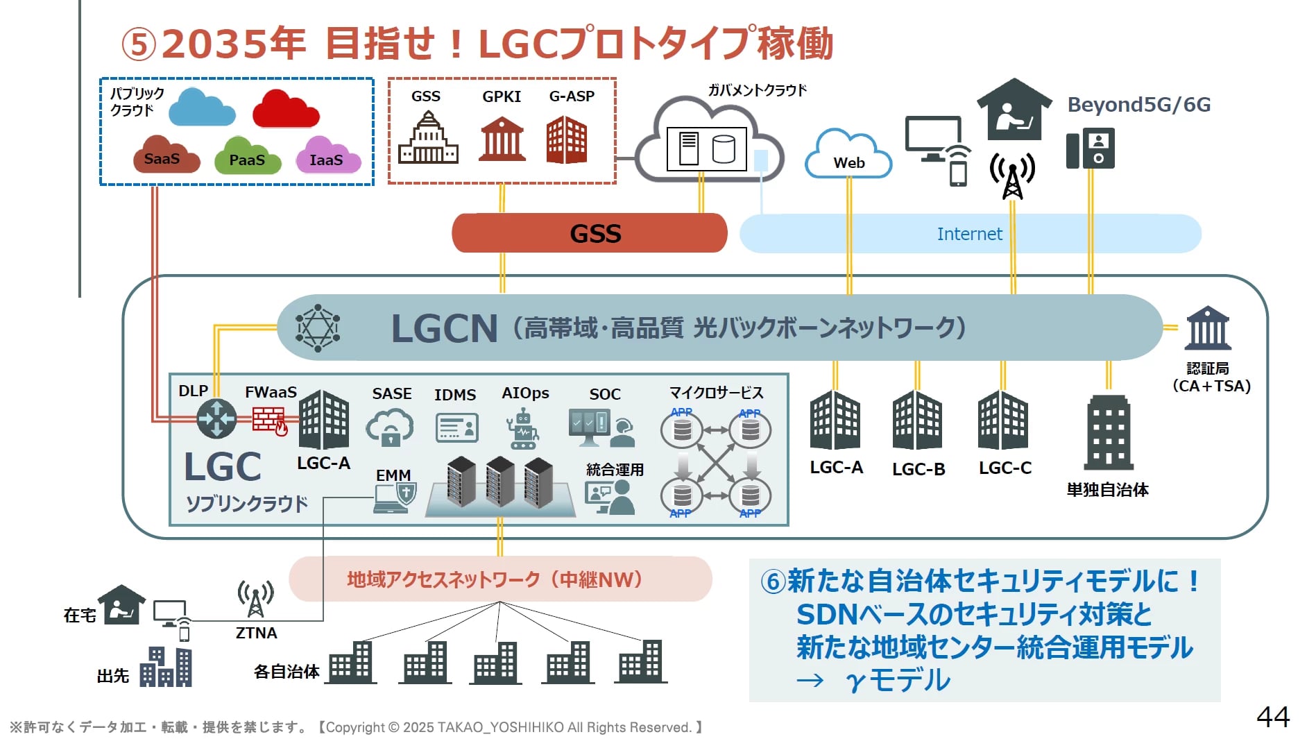 将来的には、LGCノード間接続、ソブリンクラウドの拡充、自治体アプリケーションのマイクロサービス化、セキュリティクラウド更新を契機としたLGC化なども視野に入れています。