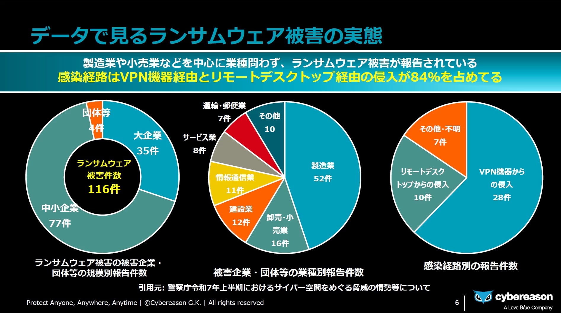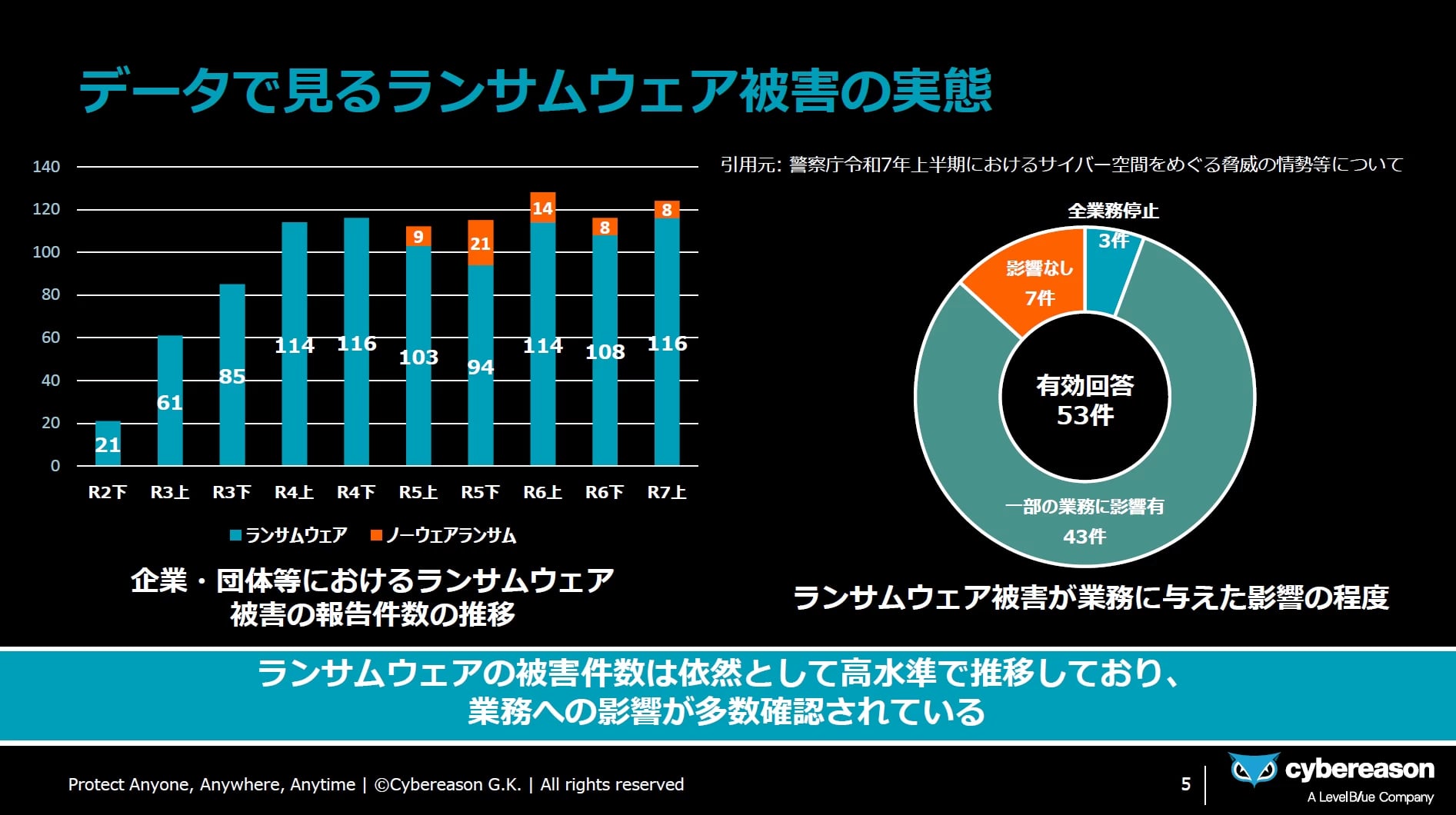 警察庁が令和7年9月に公表した資料によると、ランサムウェア被害の報告件数は令和7年上半期で116件と高水準で推移しています。前年同期と比べても大きく減っていません。