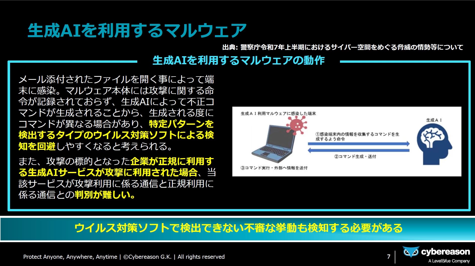 もう1つ、最近の傾向として「生成AIを利用するマルウェアの動作」が挙げられます。メール添付ファイルを開いて感染したあと、生成AIで不正コマンドを生成して受け取る仕組みです。生成されるコマンドが毎回異なるため、パターン検知型のウイルス対策ソフトでは検知を回避しやすくなると考えられます。さらに、標的企業が正規に使う生成AIサービスが悪用された場合、攻撃通信と正規通信の判別が難しくなる点も問題です。