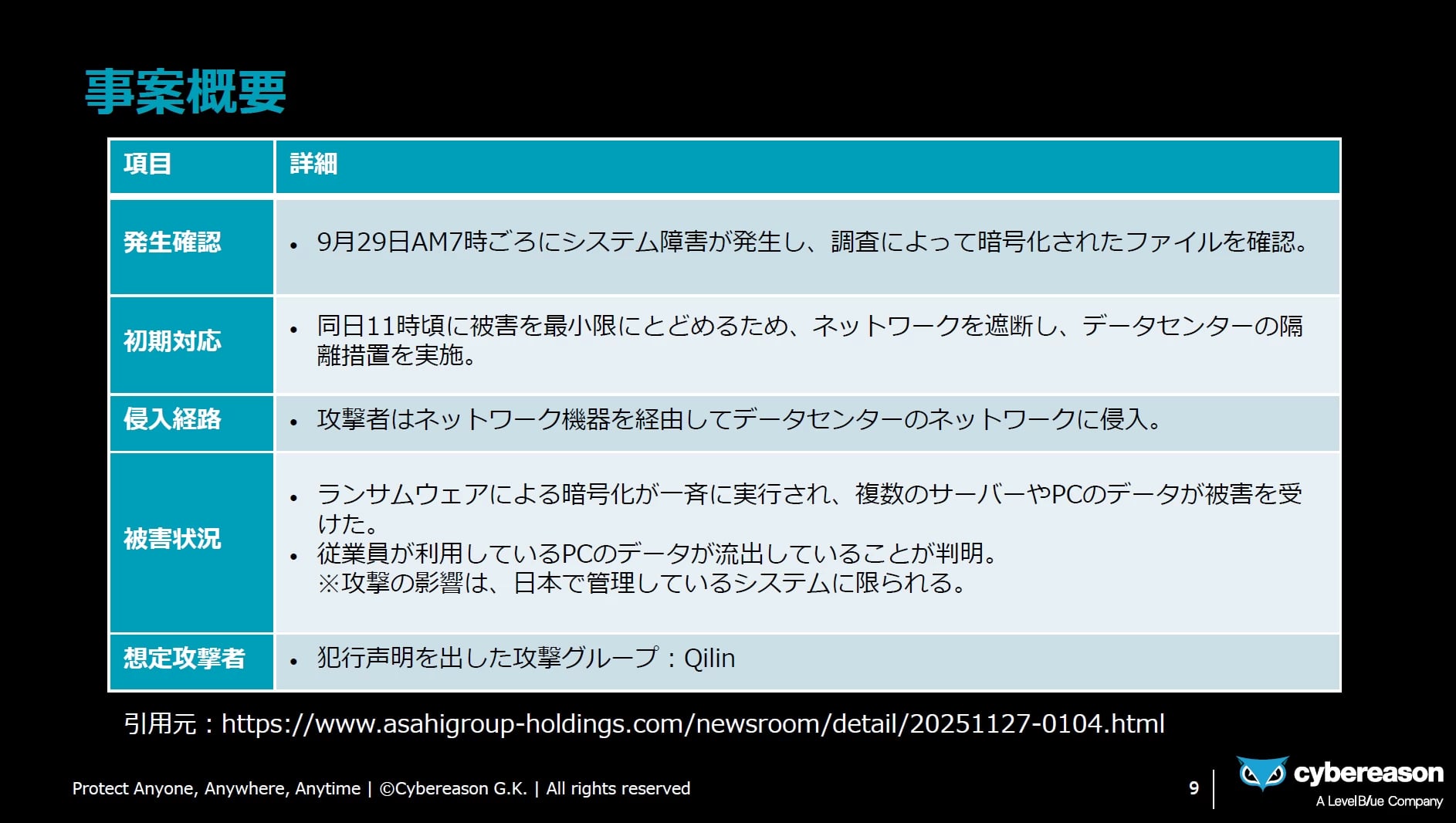 次に、皆さんの記憶にも新しい、アサヒグループホールディングスの事案について、公開情報をもとに解説します。令和7年9月29日午前7時頃にシステム障害が発生し、調査の結果、暗号化されたファイルが確認されました。同日11時頃、被害を最小限に抑えるためネットワークを遮断し、データセンターを隔離する措置を実施しています。侵入経路はネットワーク機器経由で、暗号化が一斉に実行され複数のサーバーやPCが被害を受けた、とされています。従業員PCのデータ流出も判明しています。